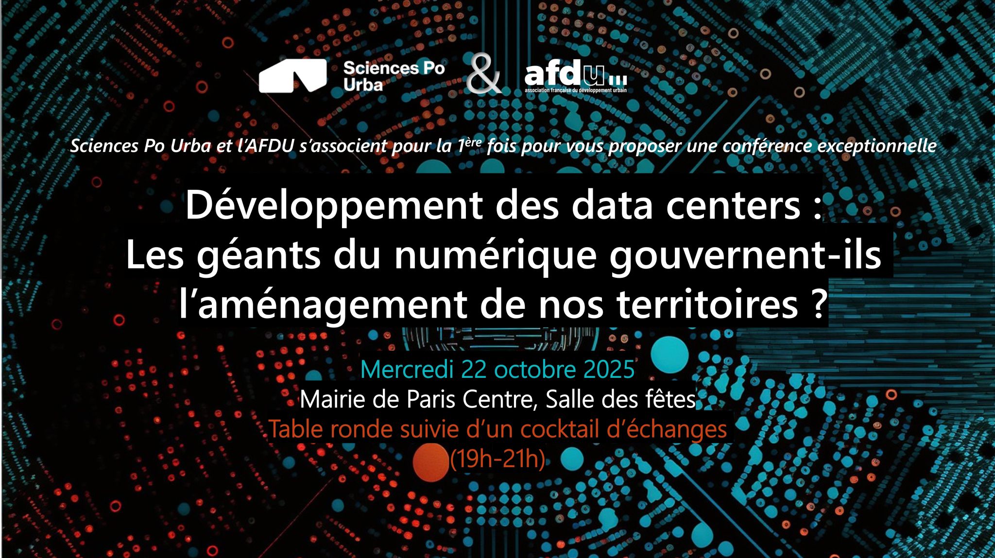 L’AFDU et Sciences Po Urbanisme unissent leurs expertises pour une conférence cocktail exceptionnelle sur les data centers et l’aménagement des territoires, le 22 octobre prochain de 19h à 21h.
