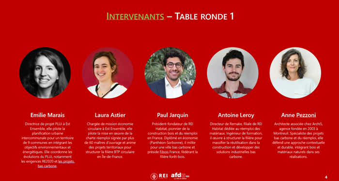 Un immense merci à nos intervenants : Emilie MARAIS (Directrice de projet PLUi — Est Ensemble) ; Laura Astier (Chargée de mission économie circulaire BTP — Est Ensemble) ; Paul Jarquin (Président — REI Habitat) ; Antoine Leroy-Boulla (Directeur — Remake, filiale réemploi de REI Habitat) ; Anne Pezzoni (Architecte — archi5) ; Antoine Soulier-Thomazeau (Directeur de l’Aménagement et des Déplacements — Est Ensemble) ; Laurent Baron (Maire du Pré‑Saint‑Gervais, Vice‑président à l’aménagement — Est Ensemble) ; Nicola LUGNANI (Responsable du développement — EPF Ile-de-France)