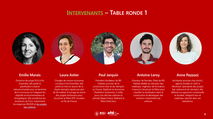 Un immense merci à nos intervenants : Emilie MARAIS (Directrice de projet PLUi — Est Ensemble) ; Laura Astier (Chargée de mission économie circulaire BTP — Est Ensemble) ; Paul Jarquin (Président — REI Habitat) ; Antoine Leroy-Boulla (Directeur — Remake, filiale réemploi de REI Habitat) ; Anne Pezzoni (Architecte — archi5) ; Antoine Soulier-Thomazeau (Directeur de l’Aménagement et des Déplacements — Est Ensemble) ; Laurent Baron (Maire du Pré‑Saint‑Gervais, Vice‑président à l’aménagement — Est Ensemble) ; Nicola LUGNANI (Responsable du développement — EPF Ile-de-France)
